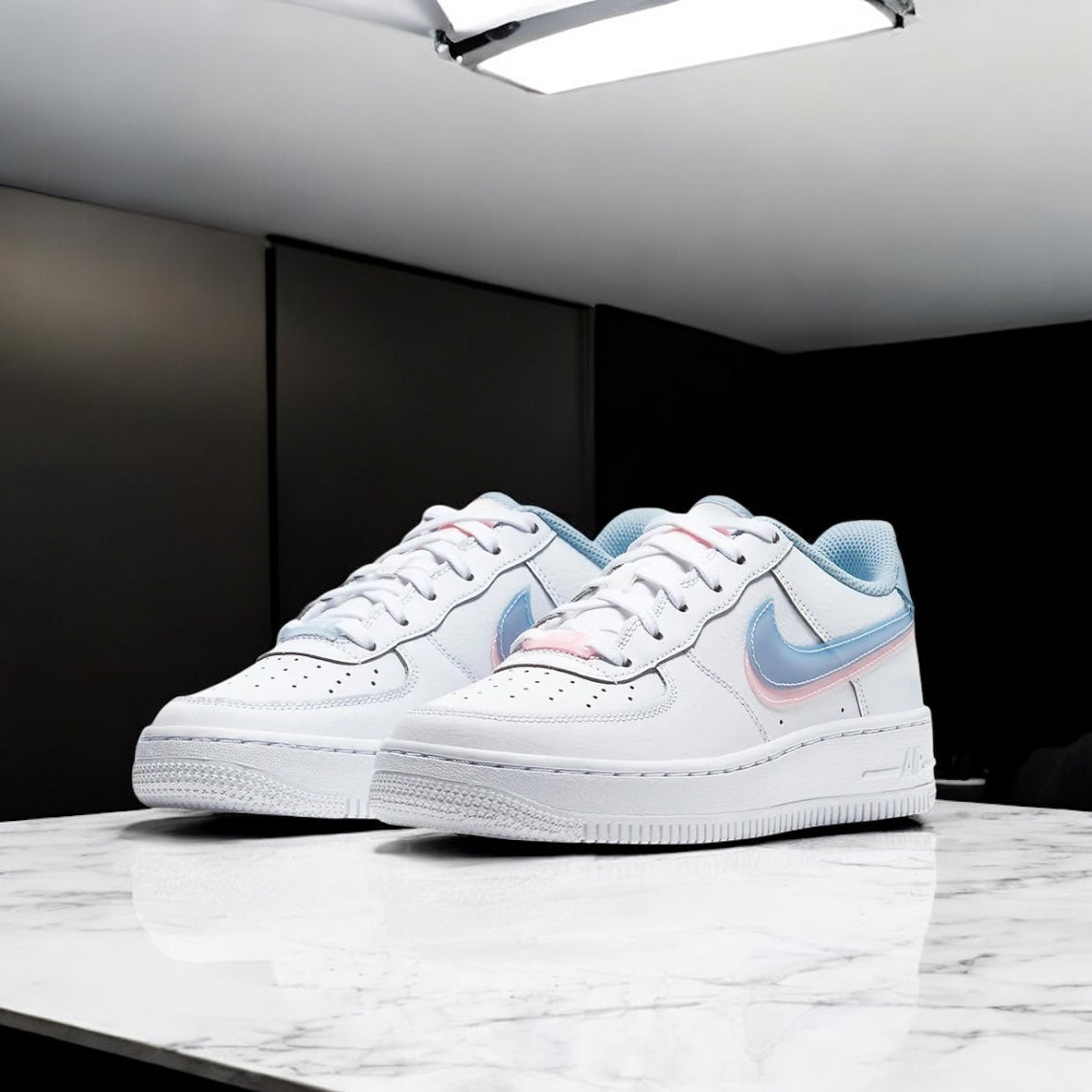 Chaussure pour femme, la Nike Air Force 1 Low « Double Swoosh » combine un cuir blanc classique avec deux logos Swoosh translucides superposés en bleu clair (“Light Armory Blue”) et rose pastel (“Arctic Punch”). Les détails de couleur s’étendent aux languettes et aux lacets, et la chaussure repose sur une semelle en caoutchouc blanche, pour un style à la fois doux, féminin et très lifestyle.
